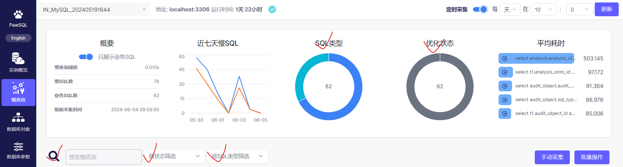 Slow query collection supports two methods: one is scheduled collection based on crontab, which can customize the collection period by year, month, day, week, hour, minute, and second. The second is manual collection to obtain the current database slow log's slow queries.