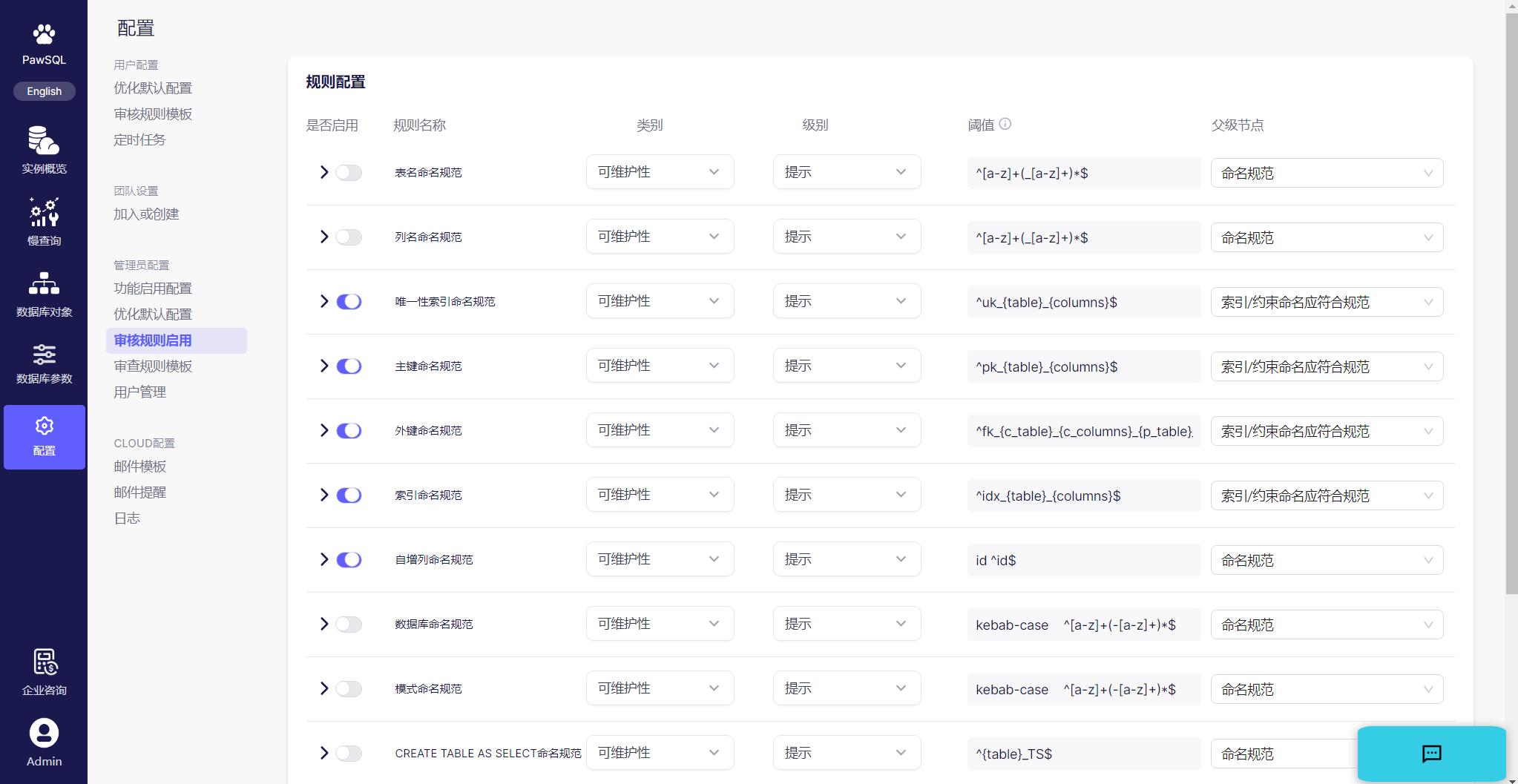 管理员可以从整体上控制启用哪些审查规则,并对可以定制化的参数设置默认值。后续的所有操作都基于管理员启用的规则进行。