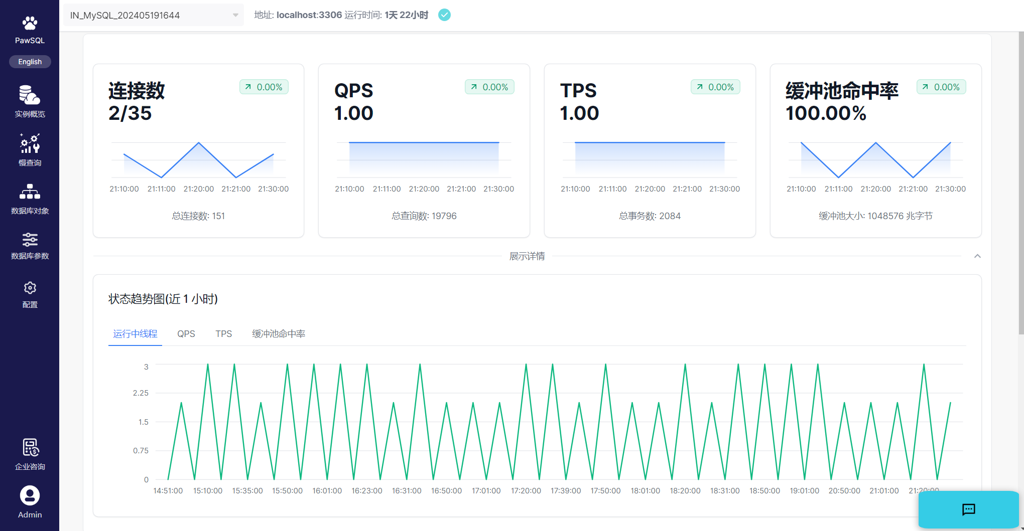 管理台展示了数据库实例的概括,包括连接数、QPS,TPS,缓冲器命中率、近7天慢查询趋势图、数据库对象巡检TOP5对象、问题类型等等。
