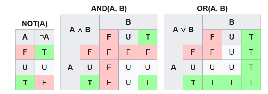 2. The logical operations(`AND, OR, NOT`) of `unknown` follows the [truth values table of three-value operations]