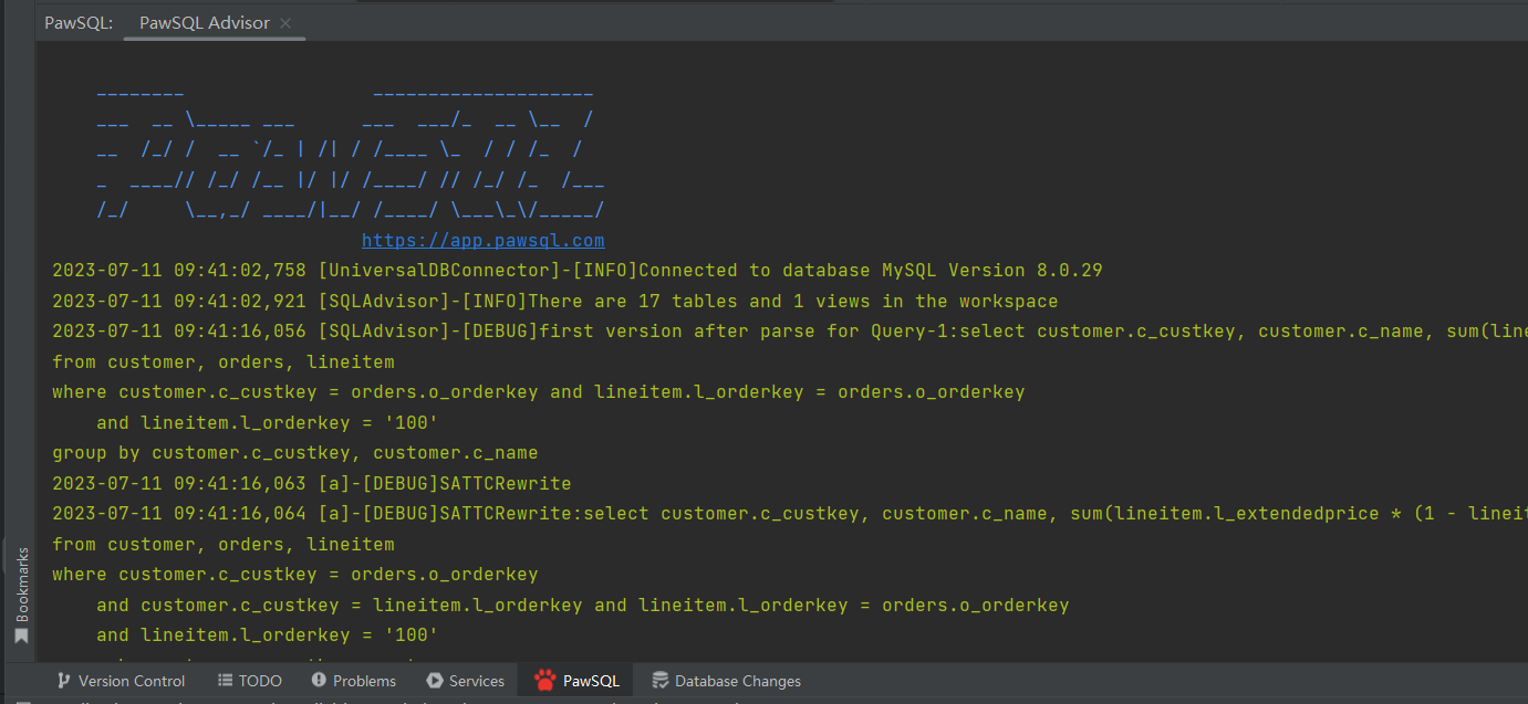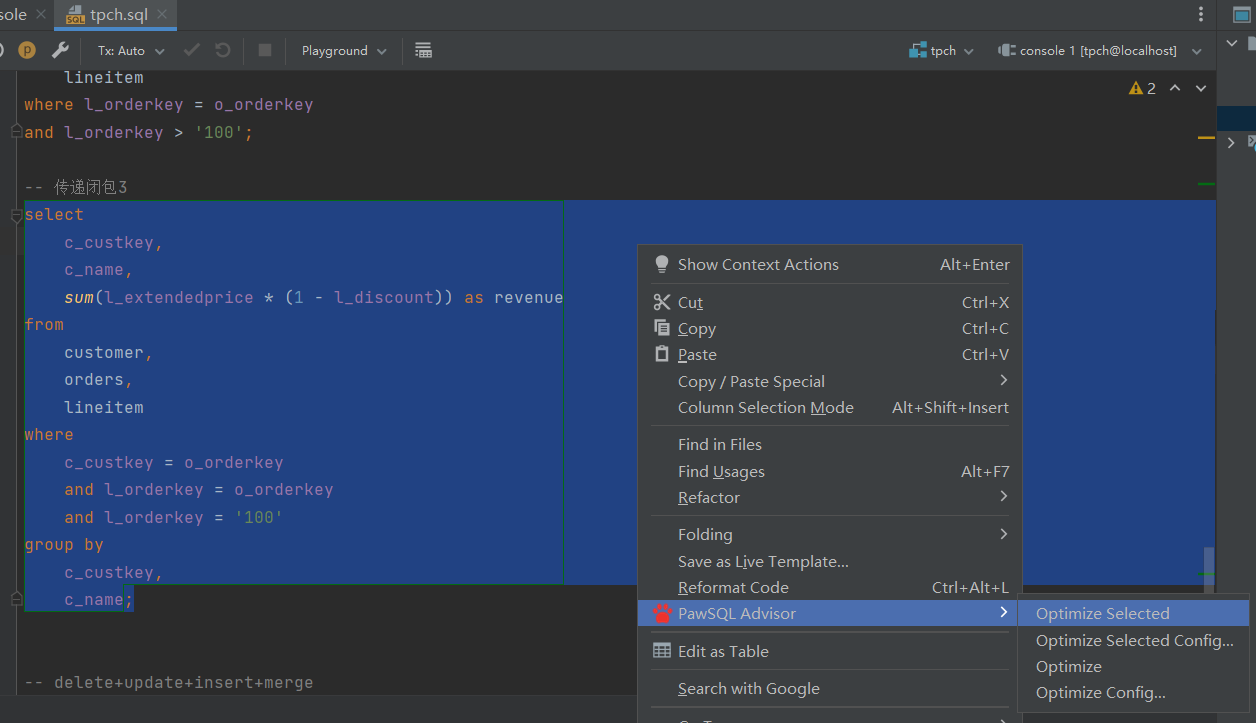 在IDE的文本/代码编辑器中选中待优化的SQL,点击右键,点击PawSQL Advisor->Optimize Selected