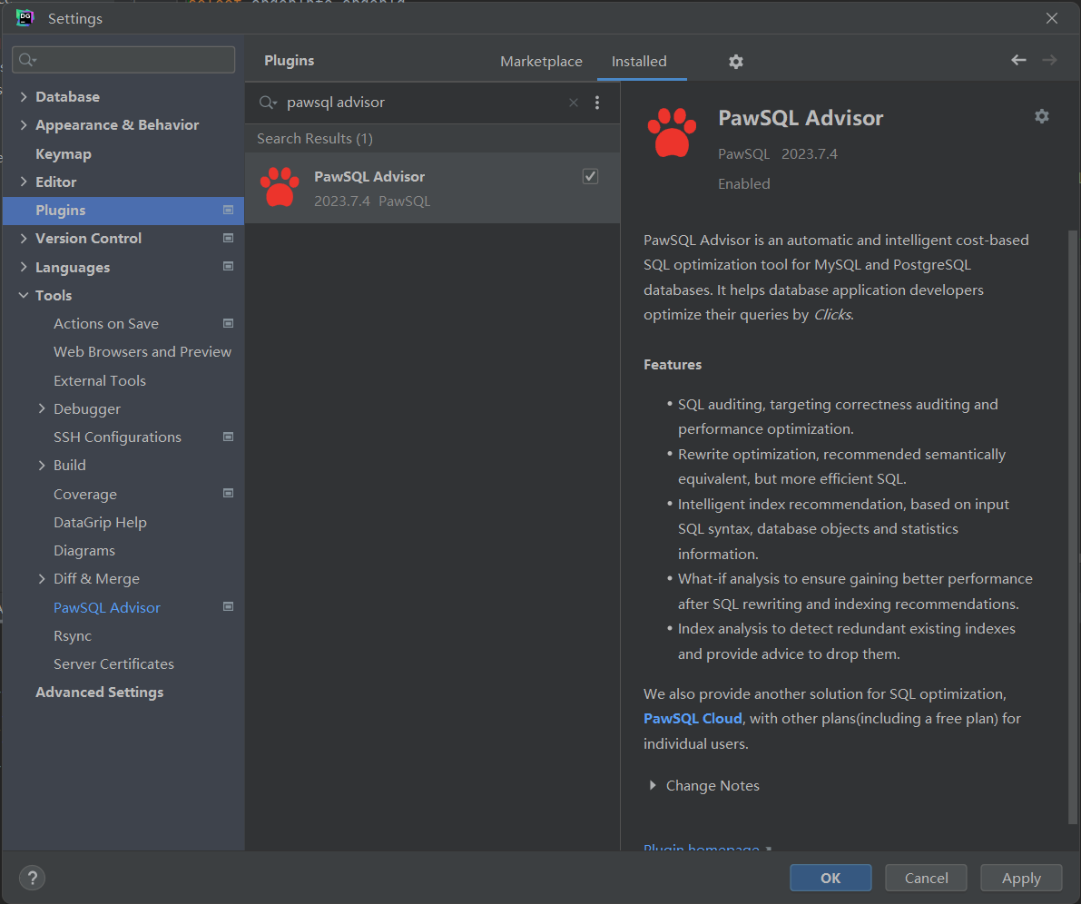 PawSQL Advisor是基于IntelliJ的IDE插件,支持的Jetbrain工具包括IntelliJ IDEA,DataGrip,PyCharm,Android Studio, AppCode, DataSpell, GoLand, PhpStorm, WebStorm等, 可以通过Jetbrain应用市场安装。