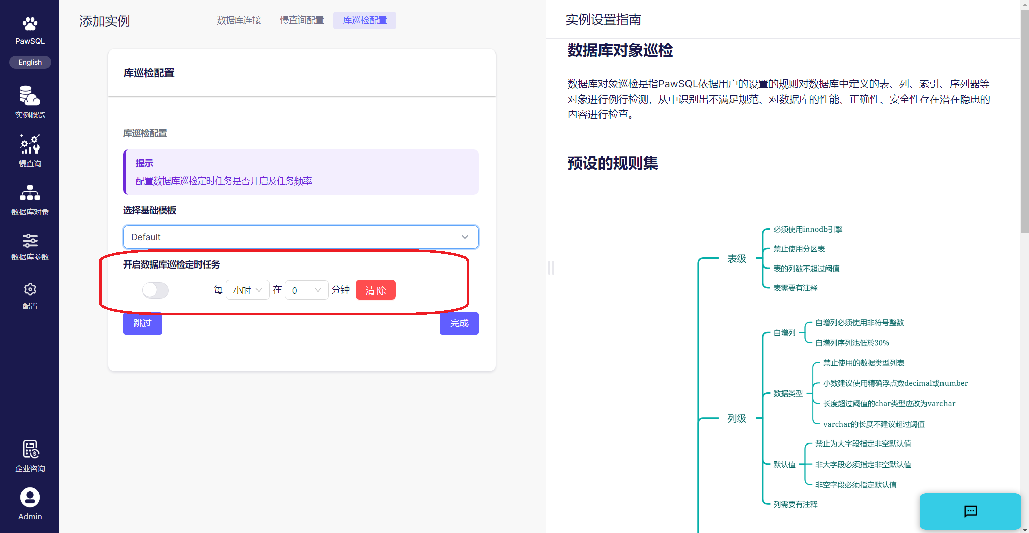 用户可以在添加实例时定义定时巡检任务,也可以后续在巡检页面修改定时巡检任务或是手动进行巡检。用户在定义巡检任务时需指定预先定义的巡检规则模板。