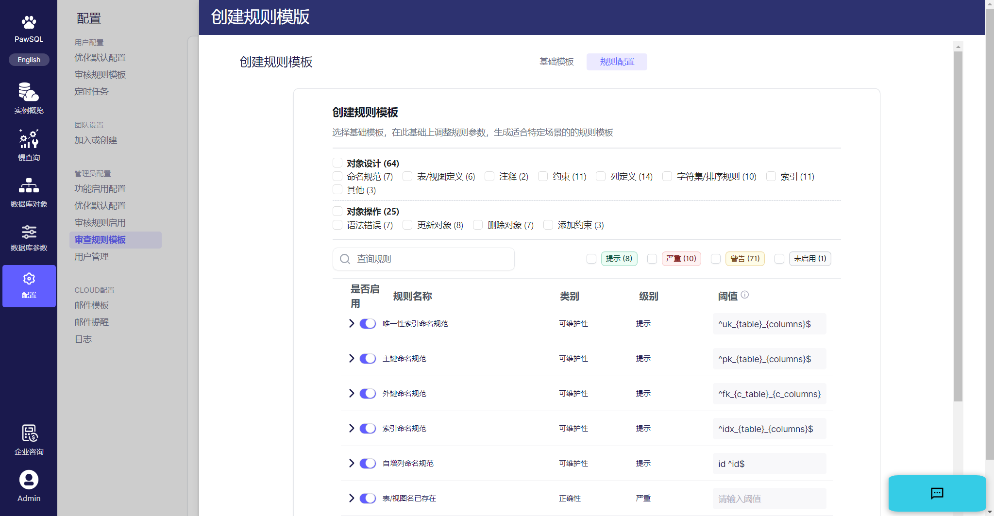 有一个默认的包含所有启用规则的名字叫default的规则模板。管理员可以基于启用的审查规则定义全局可见的审查规则模板,建议管理员为每一张数据库类型定义一个默认的审查规则模板。